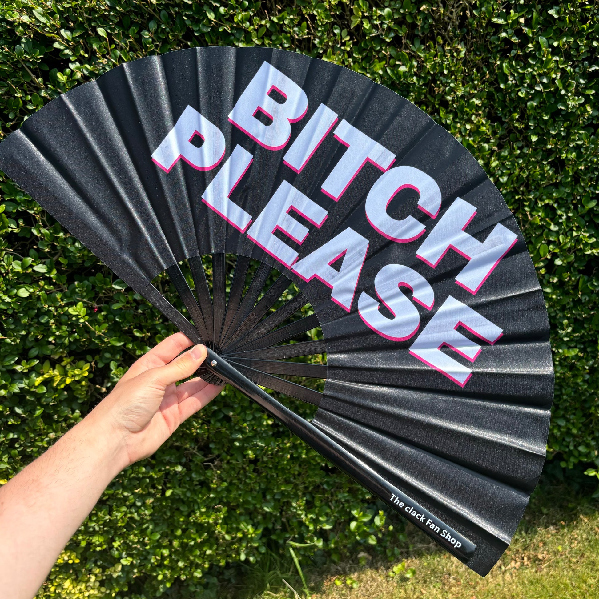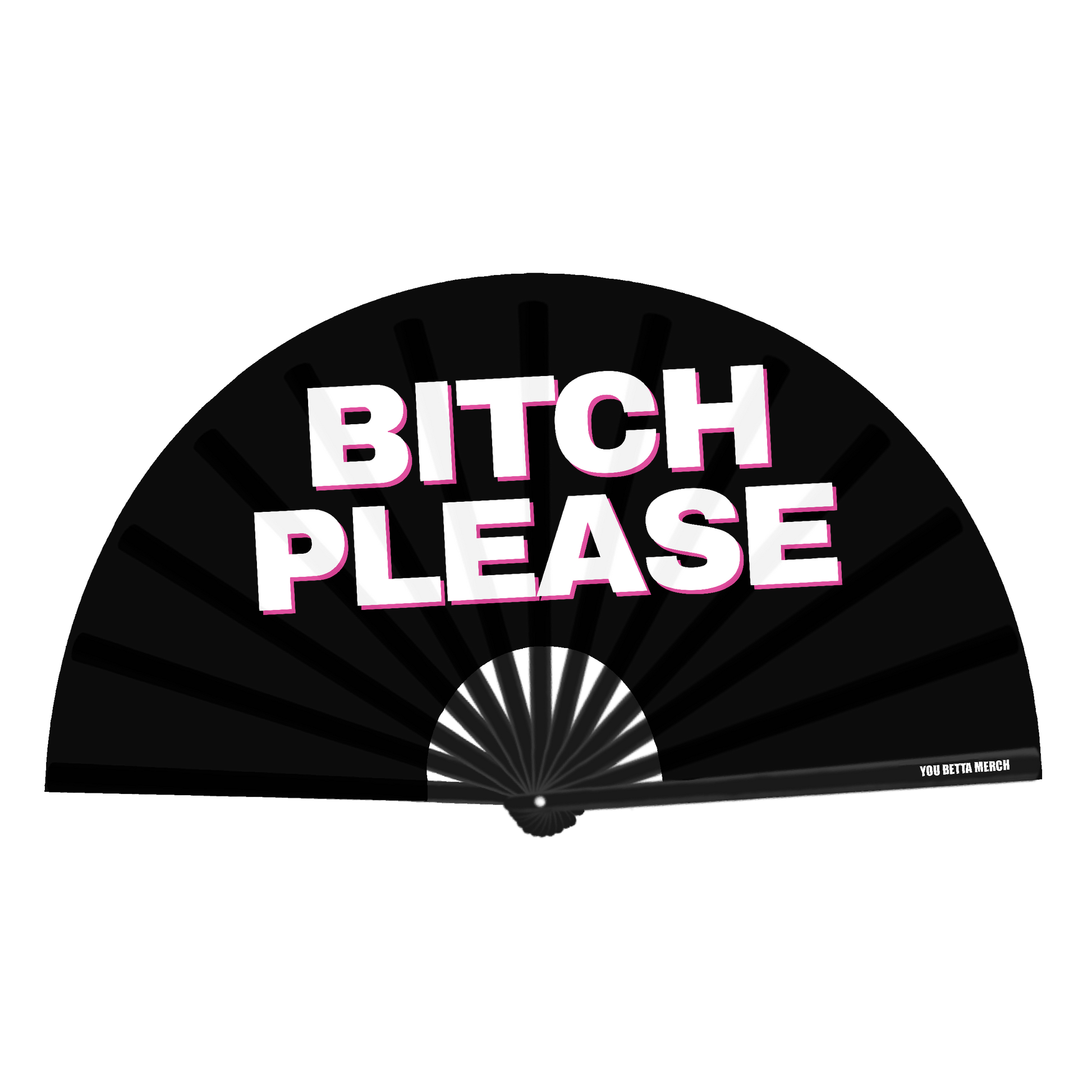 A black fabric fan with the words bitch please in all capitals across the middle!