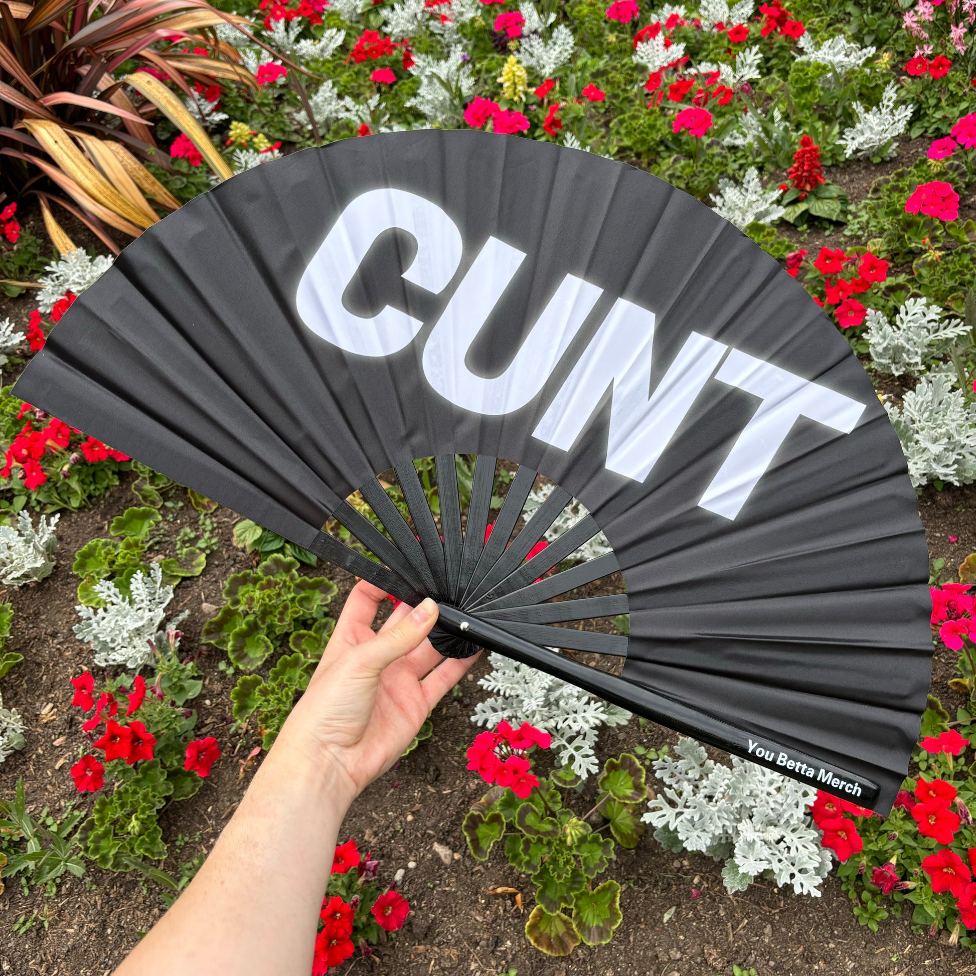 A black fabric fan with the word CUNT plastered massive in the middle! Clack Fans are a camp way to express yourself at any event! Perfect for clubs, performances, festivals and Pride events – these fans will not only help you keep cool but also stand out in a crowd. Features include;