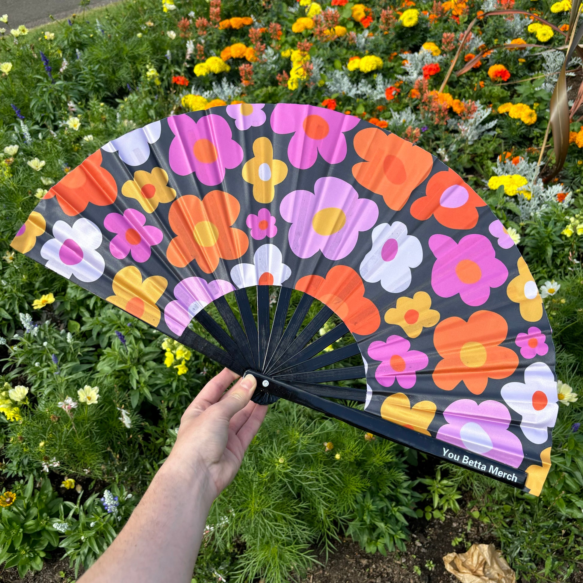 And who doesn't love flowers? Features a lightweight pink, orange a yellow print with a darker background. Clack Fans are a camp way to express yourself at any event! Perfect for clubs, performances, festivals and Pride events – these fans will not only help you keep cool but also stand out in a crowd. Features include;