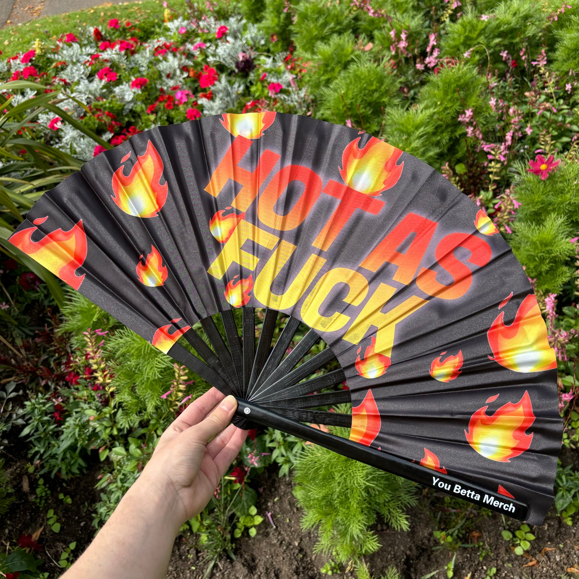A black fan covered in flame emojis and the wording HOT AS F*CK! Clack Fans are a camp way to express yourself at any event! Perfect for clubs, performances, festivals and Pride events – these fans will not only help you keep cool but also stand out in a crowd. Features include;- Large Size: 33cm Closed | 62cm Open (13in Closed | 24.5in Open.)