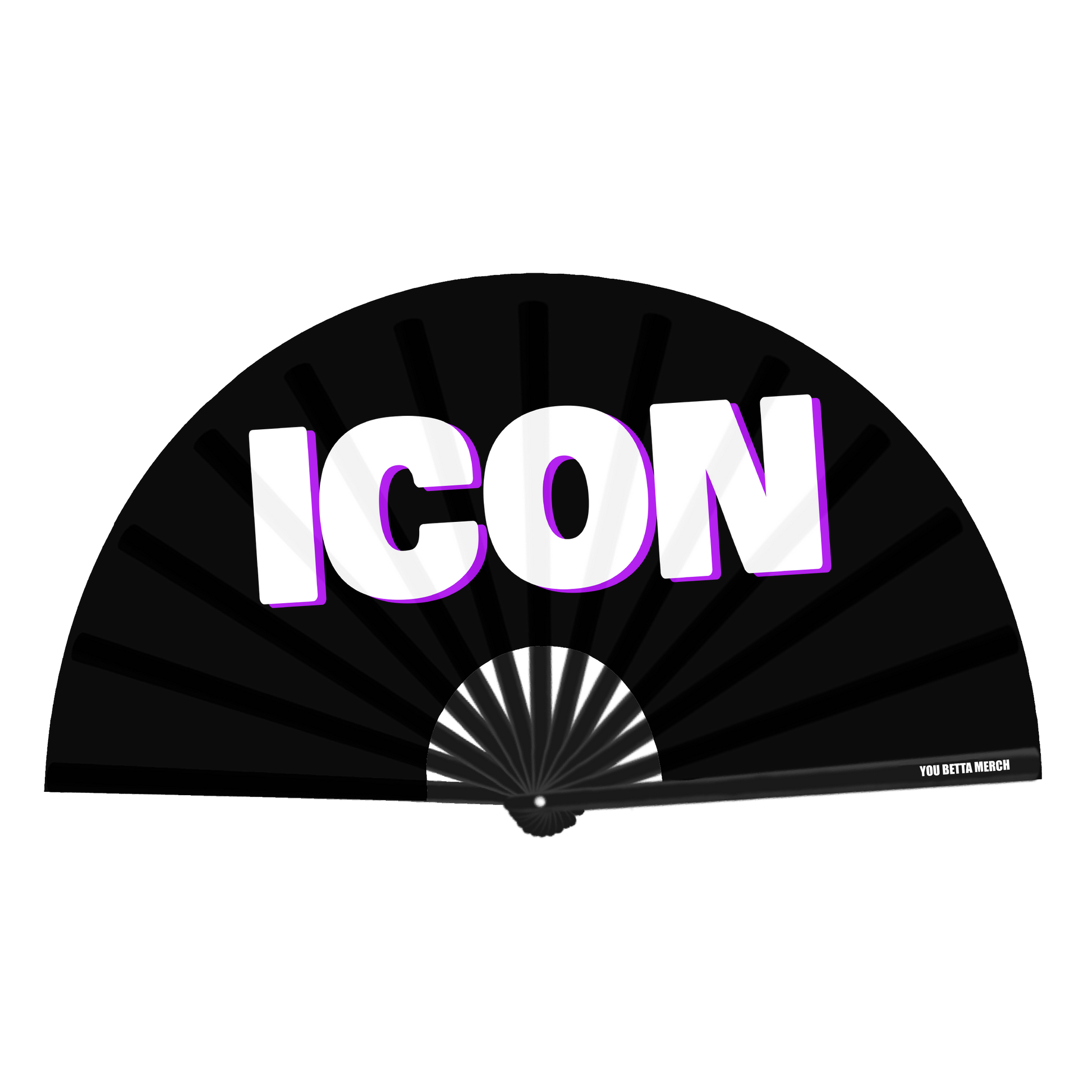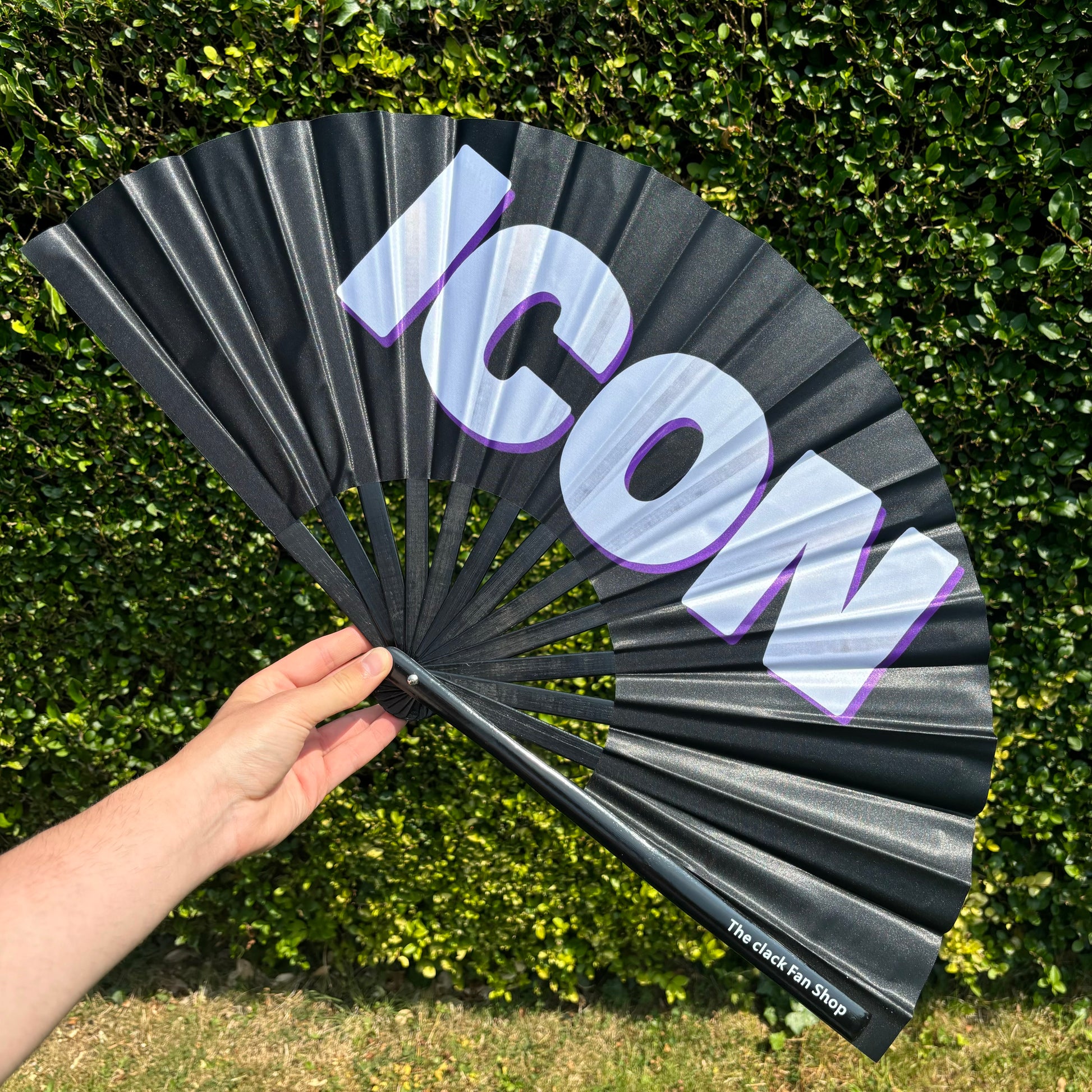 A plain black fan with the word "ICON" in capitals across the middle in white. Clack Fans are a camp way to express yourself at any event! Perfect for clubs, performances, festivals and Pride events – these fans will not only help you keep cool but also stand out in a crowd. Features include;