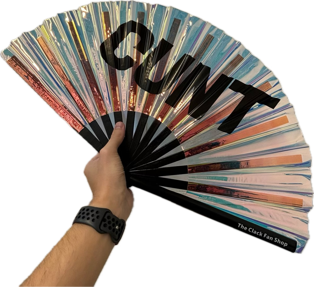An iridescent fan with the word CUNT across the middle in a black font! Clack Fans are a camp way to express yourself at any event! Perfect for clubs, performances, festivals and Pride events – these fans will not only help you keep cool but also stand out in a crowd. Features include;