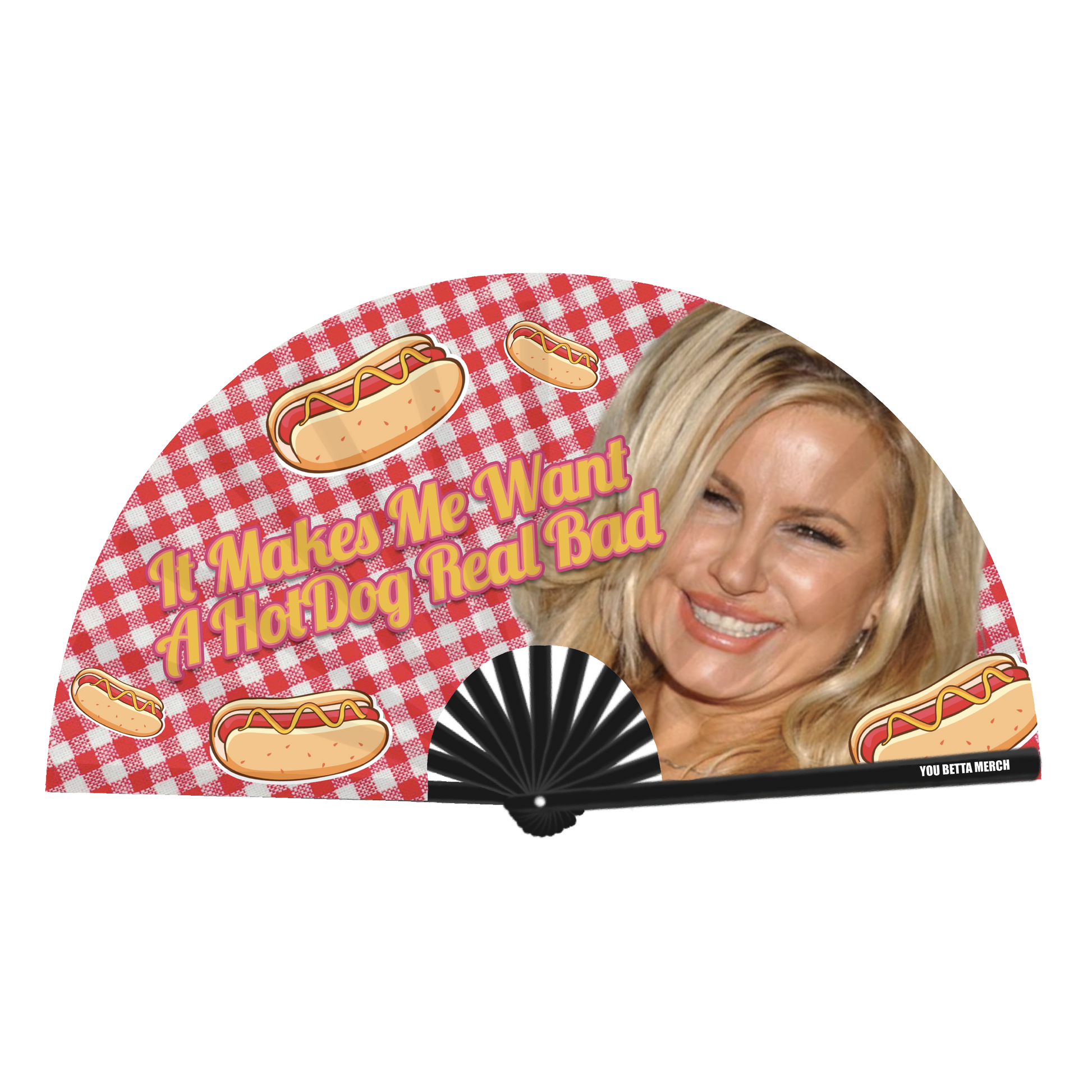 Get your iconic line from Jennifer Coolidge on a fan right now! Comes with a gingham print fan covered in hot dogs and Jen's face! Clack Fans are a camp way to express yourself at any event! Perfect for clubs, performances, festivals and Pride events – these fans will not only help you keep cool but also stand out in a crowd. Features include;