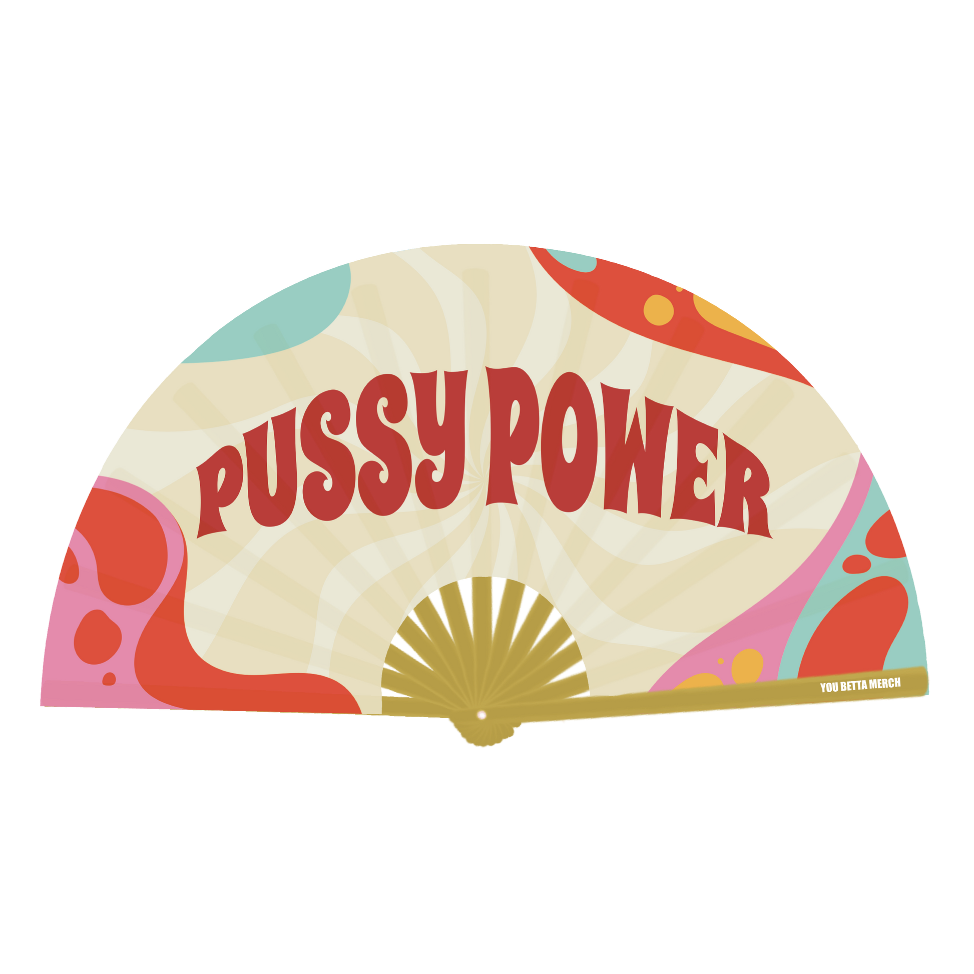 A multi coloured fan background with the wording Pussy Power over the centre. Clack Fans are a camp way to express yourself at any event! Perfect for clubs, performances, festivals and Pride events – these fans will not only help you keep cool but also stand out in a crowd. Features include;