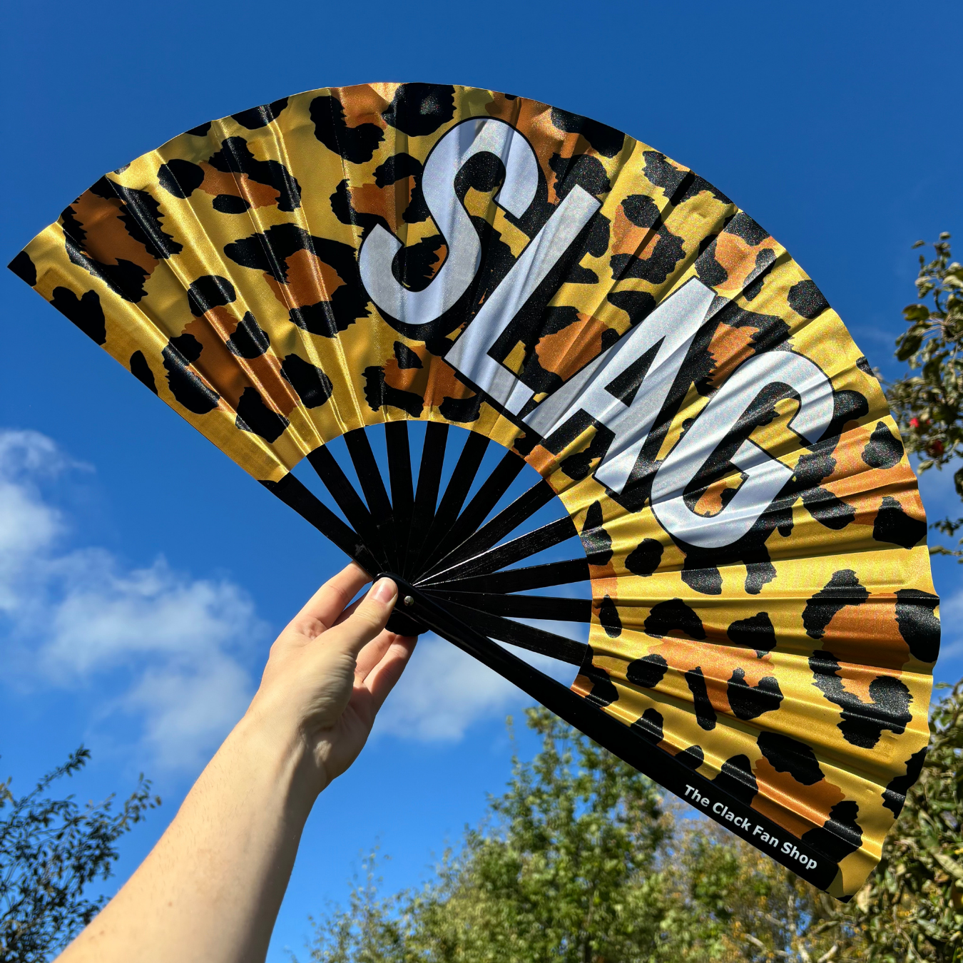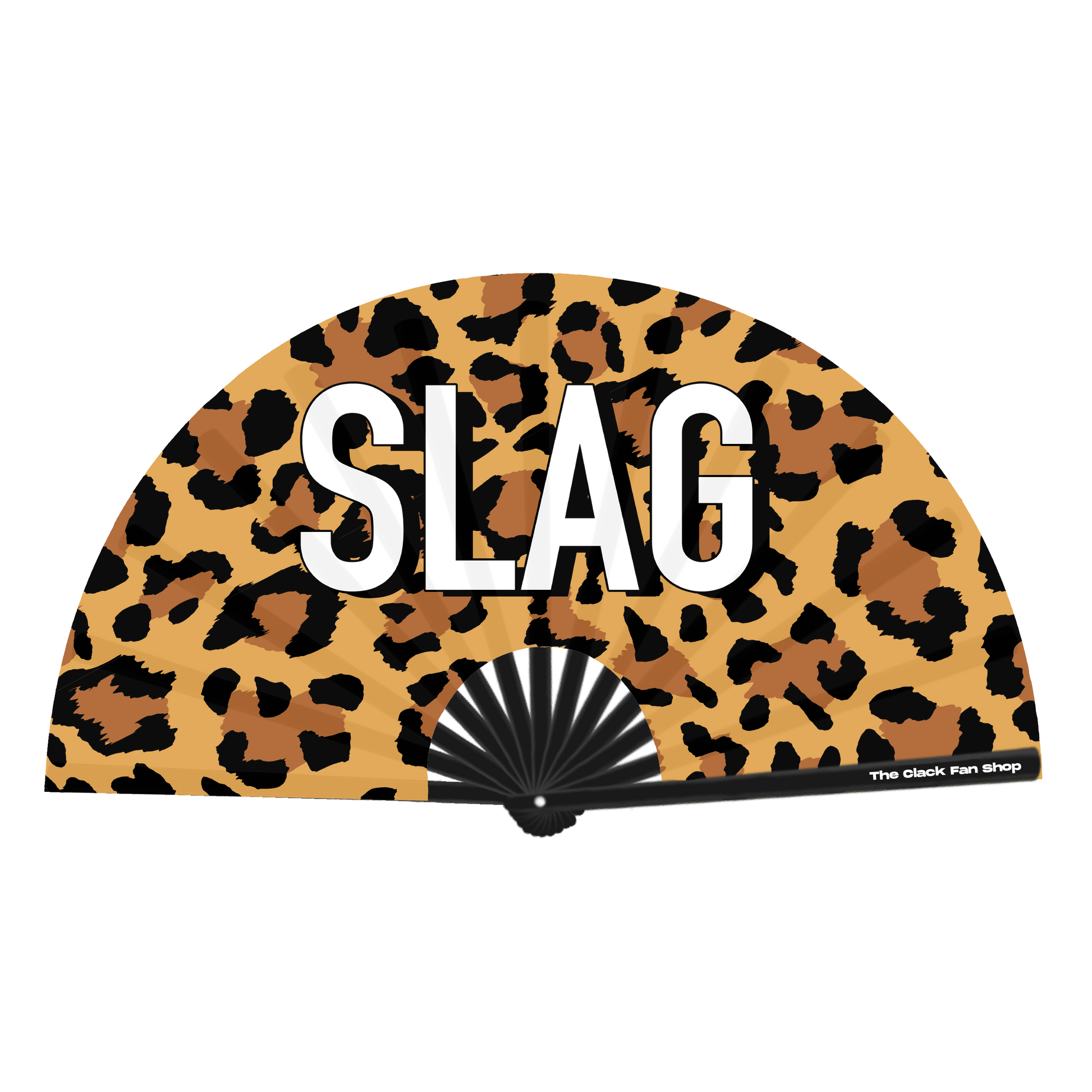 A pink leopard print fan with the word SLAG written in the middle. Clack Fans are a camp way to express yourself at any event! Perfect for clubs, performances, festivals and Pride events – these fans will not only help you keep cool but also stand out in a crowd. Features include;